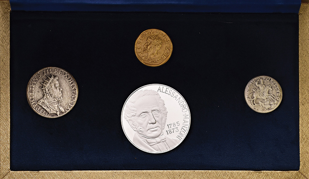 ALESSANDRO MANZONI.Astuccio con una medaglia in argento e tre riproduzioni di...