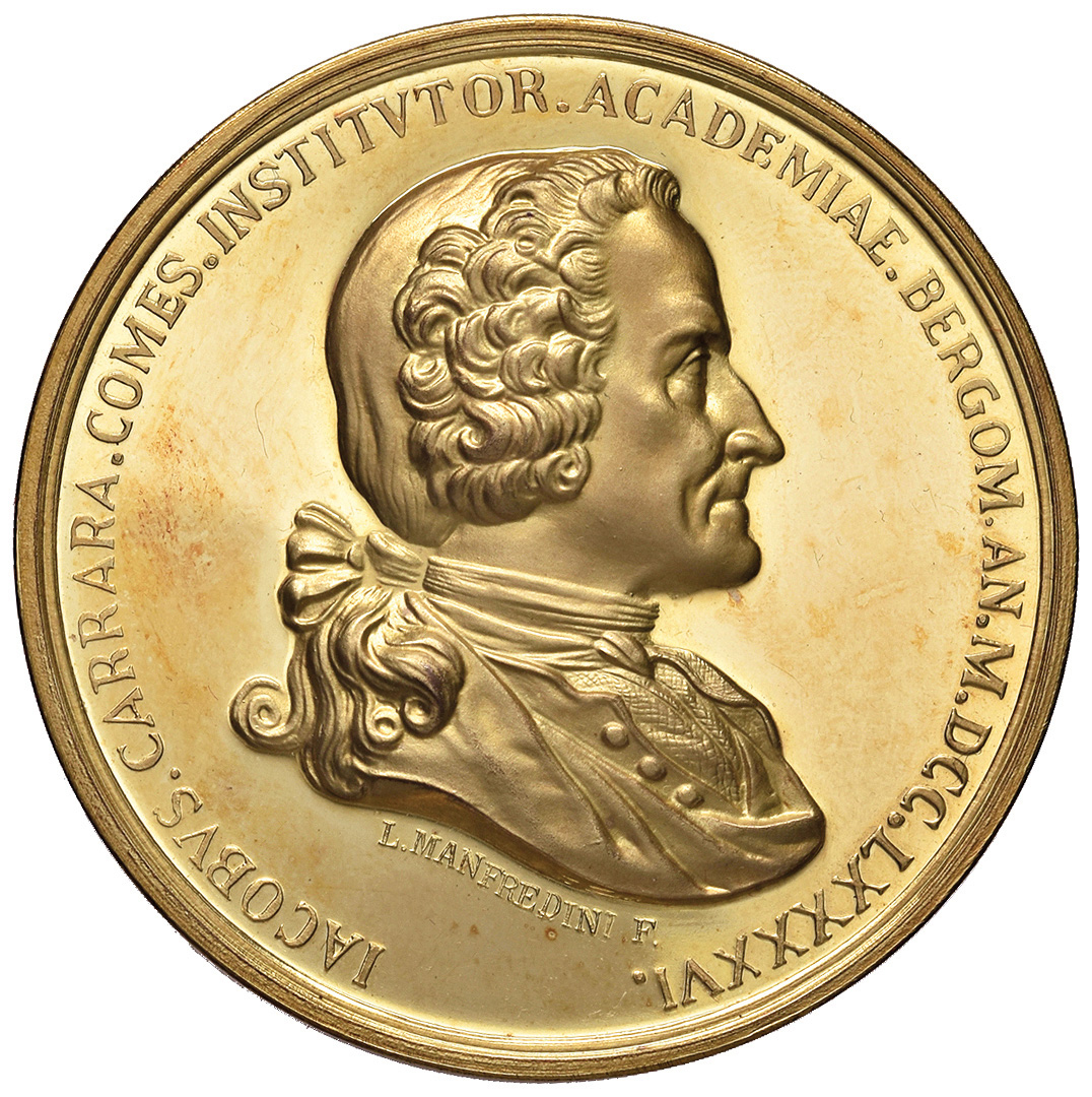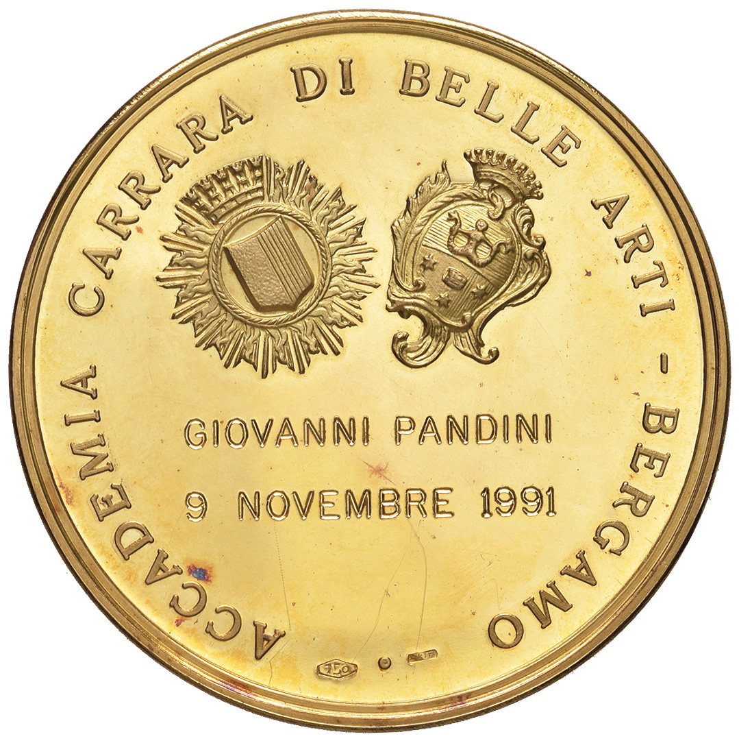 Accademia Carrara. Medaglia in oro conferita a Giovanni Pandini nel 1991, con al D/ l'effigie di Giacomo Carrara, opus L. Manfredini (mm. 39.5)