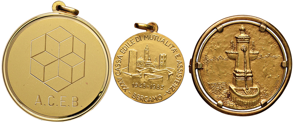 Tre medaglie in oro: Acquedotti Civici di Bergamo, 1913-1963 in anello con spilla, SPL; XXXV Cassa Edile di Mutualità e assistenza 1948-1983, 1984, colpo sul bordo, SPL; Associazione Costruttori Edili della Provincia di Bergamo, SPL