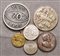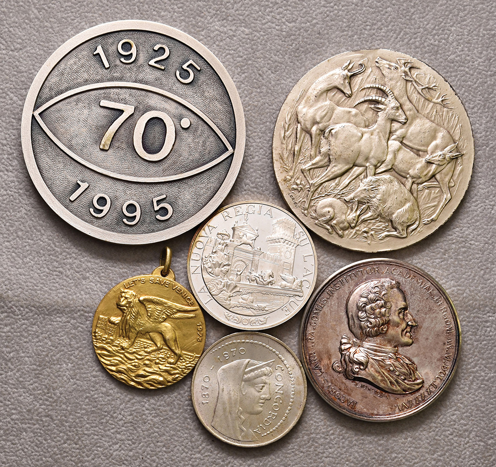 Astuccio con cinque medaglie in argento (di cui una dorata) e una moneta da...