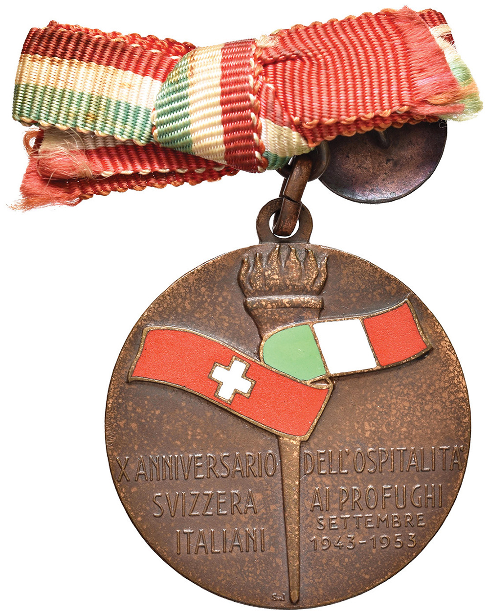 Unione Regionale delle Provincie Lombarde. Medaglia per il X anniversario dell'Ospitalità Svizzera ai Profughi Italiani. AE con smalti, mm. 30,5.