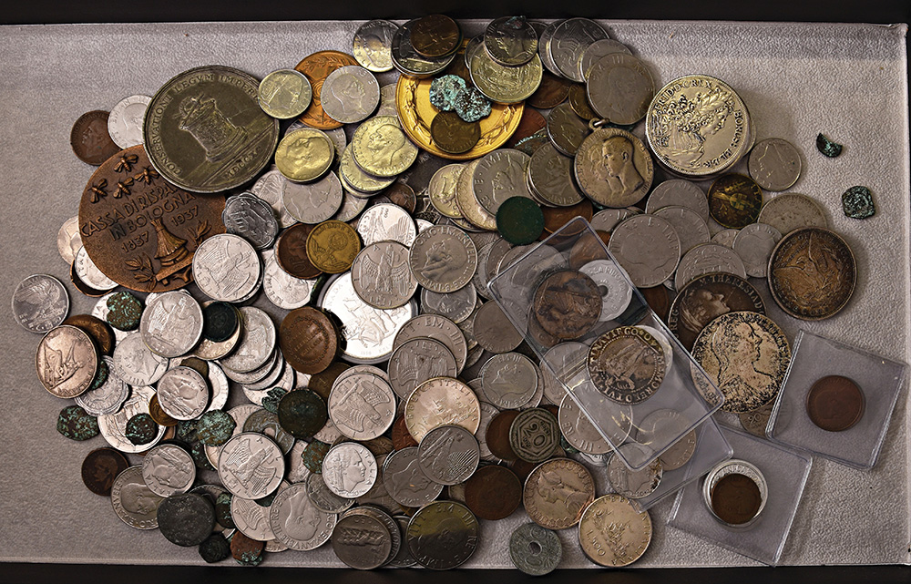 Scatoletta con un insieme di monete, medaglie e pochi gettoni. Metalli vari.