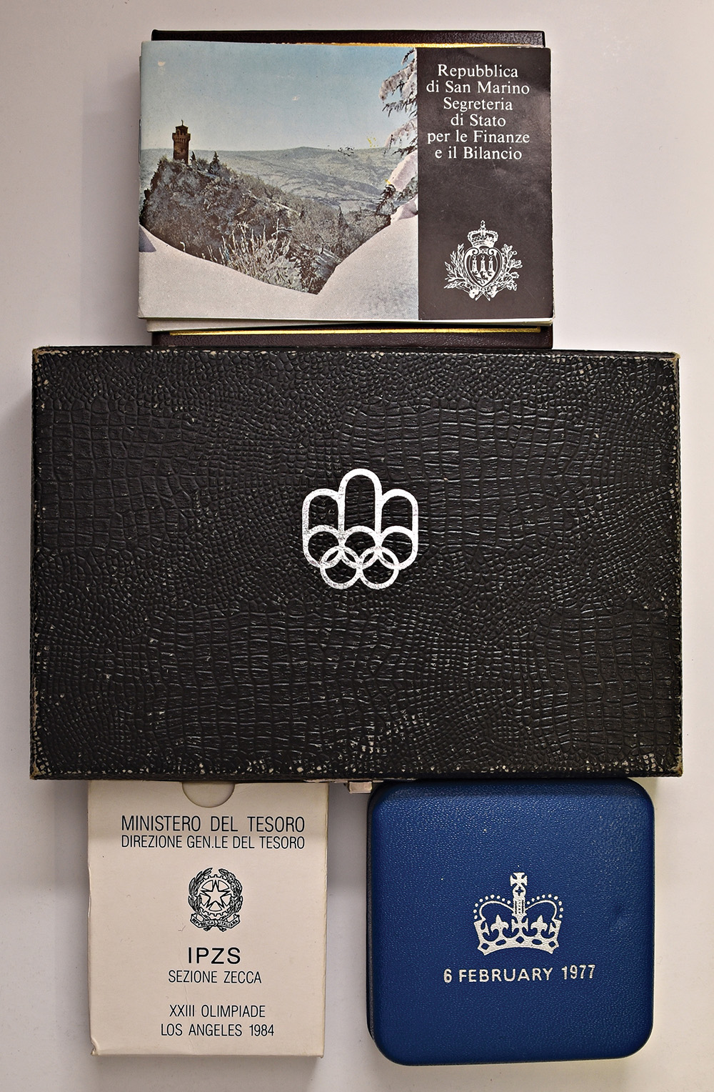 Scatoletta con 4 monete per le Olimpiadi di Montreal 1976 (10 e 5 dollari), più 17 monete (di cui 13 da 500 lire commemorative e due da 1000 lire), più 10 lingottini da un'oncia (di cui 7 per le olimpiadi di Mosca del 1980). Complessivamente 21 monete e 10 lingottini, tutto in argento.