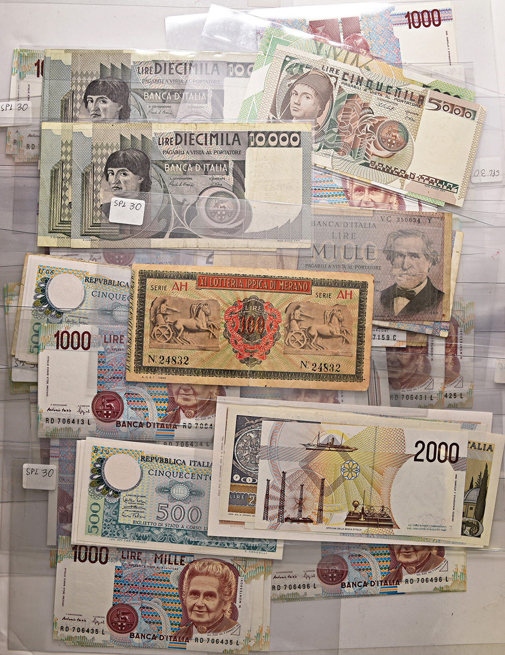 Un insieme di banconote, quasi tutte da 1000 lire, molte FdS. In lotto un biglietto della XI Lotteria Ippica di Merano da 100 lire.