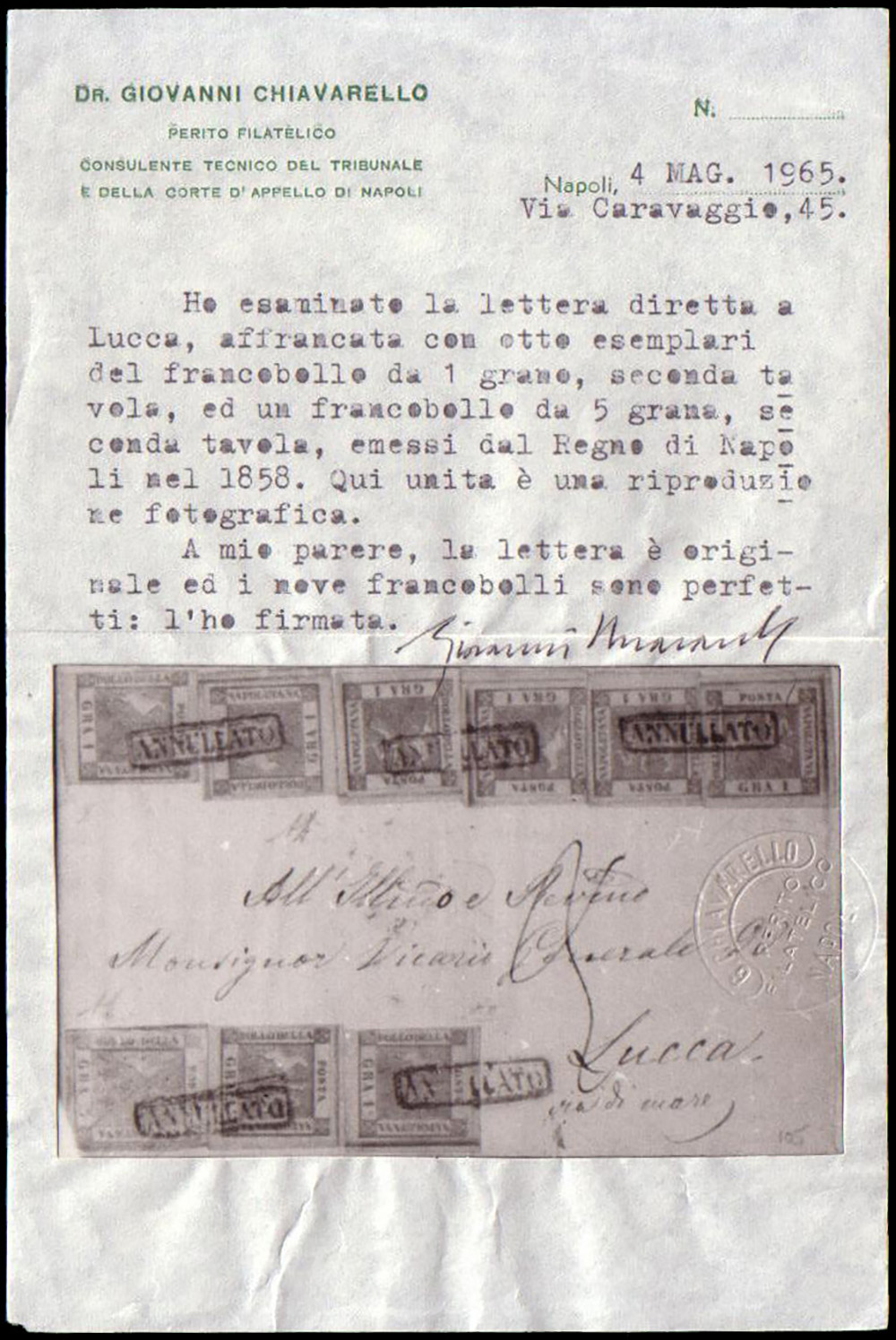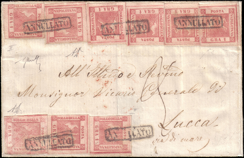 Lettera via di mare, senza testo, da Napoli per Lucca (periodo di Governo Provvisorio), affrancata per complessivi 13g. con 8 esemplari dell'1g. e 1 esemplare del 5g., tutti II tavola. Tassata per 20c. in arrivo. Da esaminare.