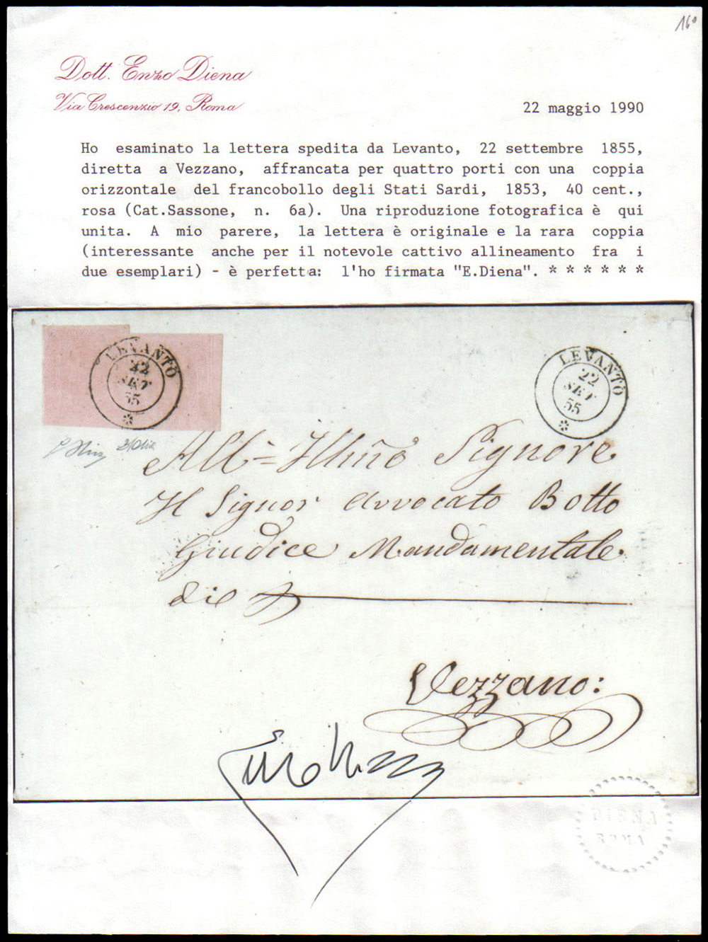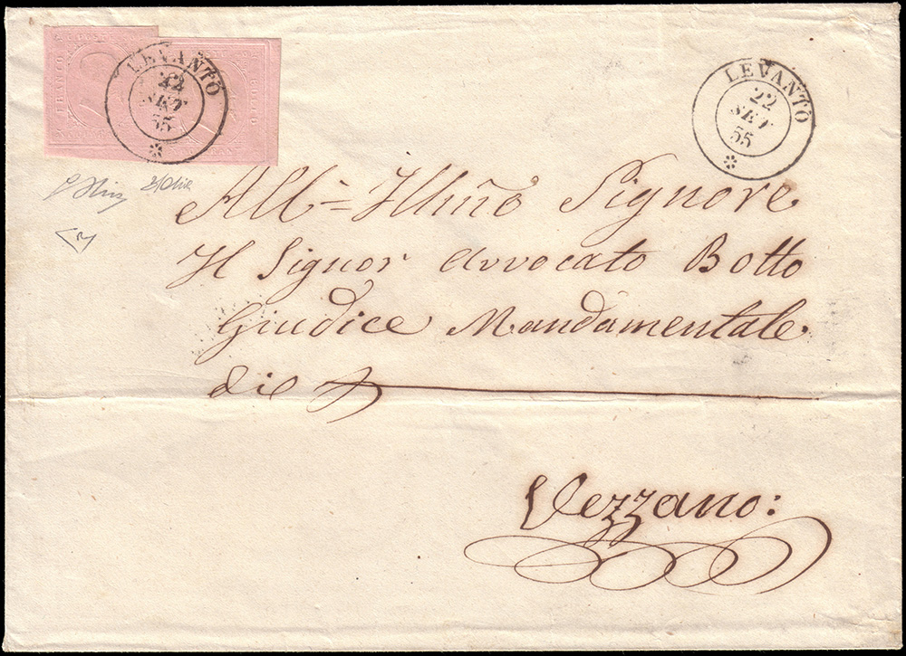 Letter from Levanto for Vezzano, franked with strongly misaligned pair of the 40c. rose.