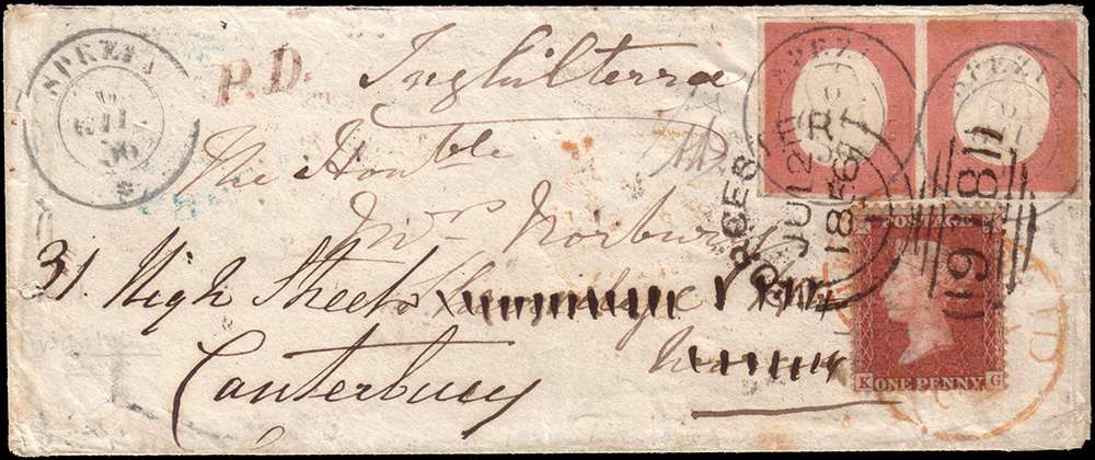 Busta spedita da La Spezia per Worchester, affrancata con coppia orizzontale del 40c. rosso mattone, in seguito inoltrata da Worcester per Canterbury tramite un francobollo di Gran Bretagna da 1 penny rosso bruno.