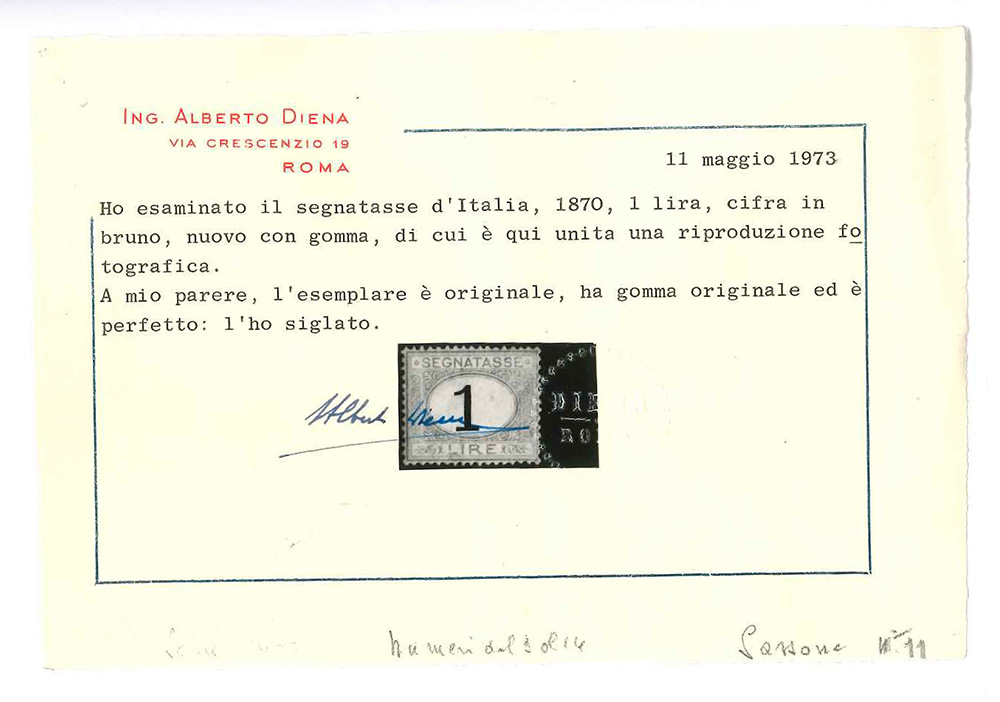 [REGNO D'ITALIA] 1870Segnatasse. 1 lira azzurro chiaro e bruno. Cert. A....