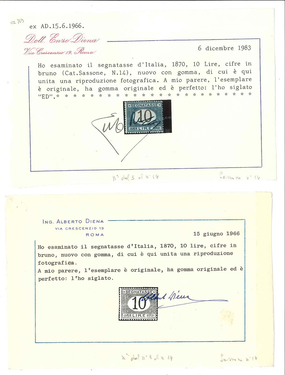 Lot 315 | [REGNO D'ITALIA] 1874Segnatasse. 10 lire azzurro e bruno. Cert. En. Diena....