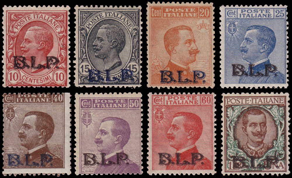 "B.L.P.". Complete set of 8 values ​​with lithographic overprint type II.