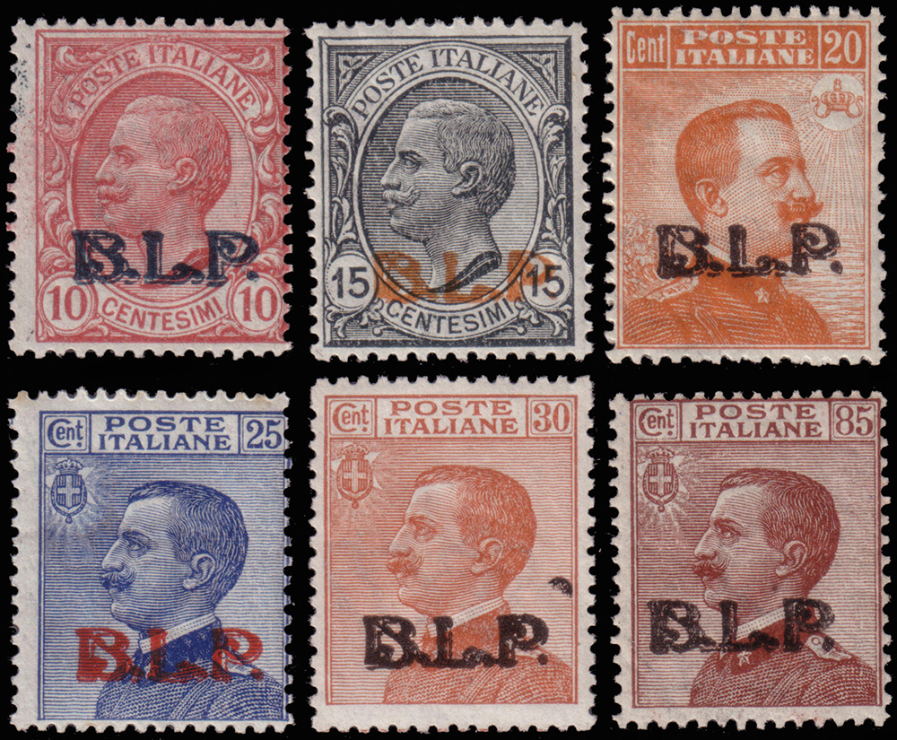"B.L.P.". Serie completa di 6 valori con soprastampa tipografica del III tipo.