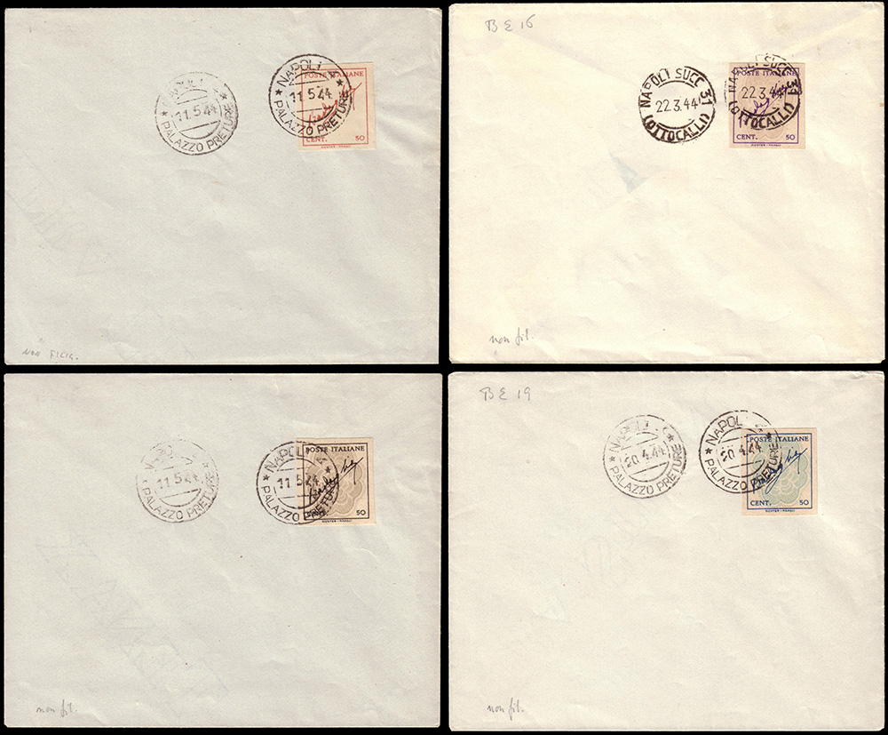 "Badoglio signature". Complete set of 4 values imperforated and without watermark, applied individually on covers and cancelled to order.