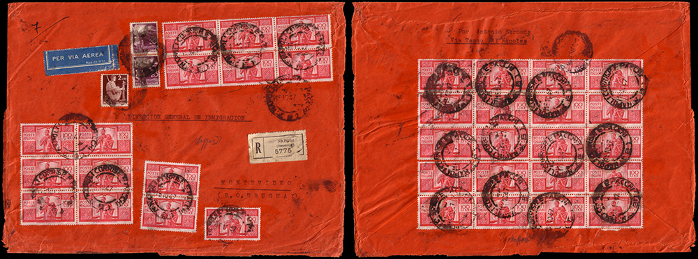 Cover registered by air, from Naples to Montevideo (Uruguay), franked 3'542 lire with 35 examples of 100 lire "Democratica" set plus 3 examples of the same set. Franking has some slight defects, as is usual for this type of cover.