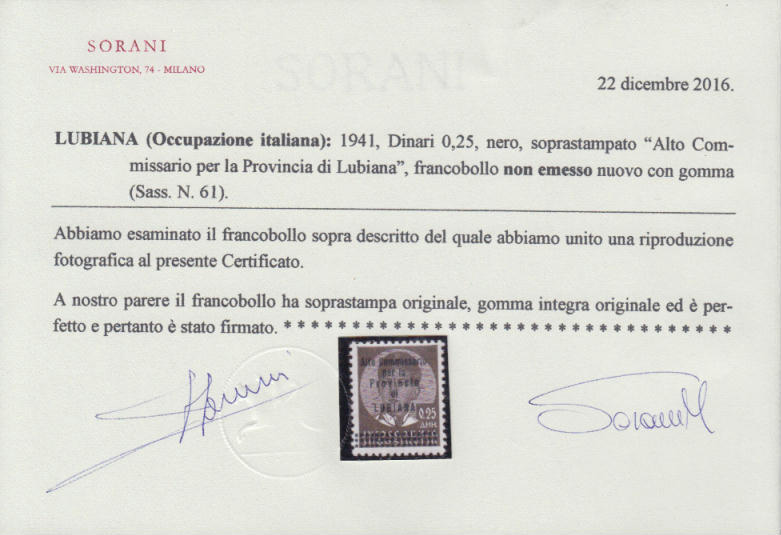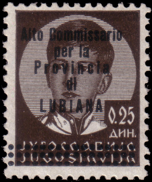 0,25 dinari nero, soprastampato "Alto Commissariato per la Provincia di Lubiana", non emesso.