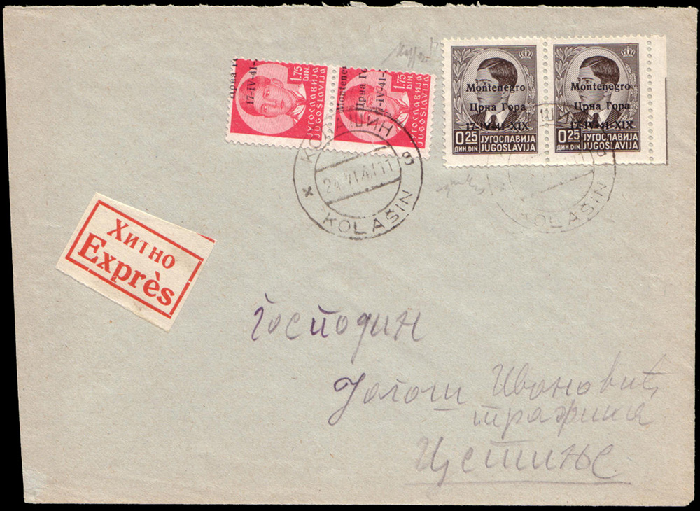 Cover sent by express mail from Kolasin to Cettigne, franked with horizontal pair of 0.25d. black and vertical pair of not issued 1.75d. carmine. The bottom example of the 1.75d. pair presents a wrinkle.
