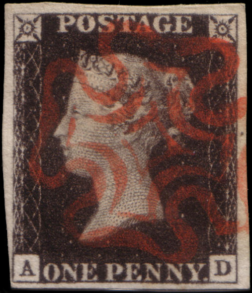 "Penny Black". 1d. nero (A-D) con annullo "Croce di Malta" in rosso.