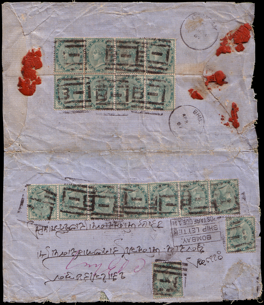 Busta per Bombay, affrancata con 17 esemplari del ½a. verde, tassata per 1a. Da esaminare.