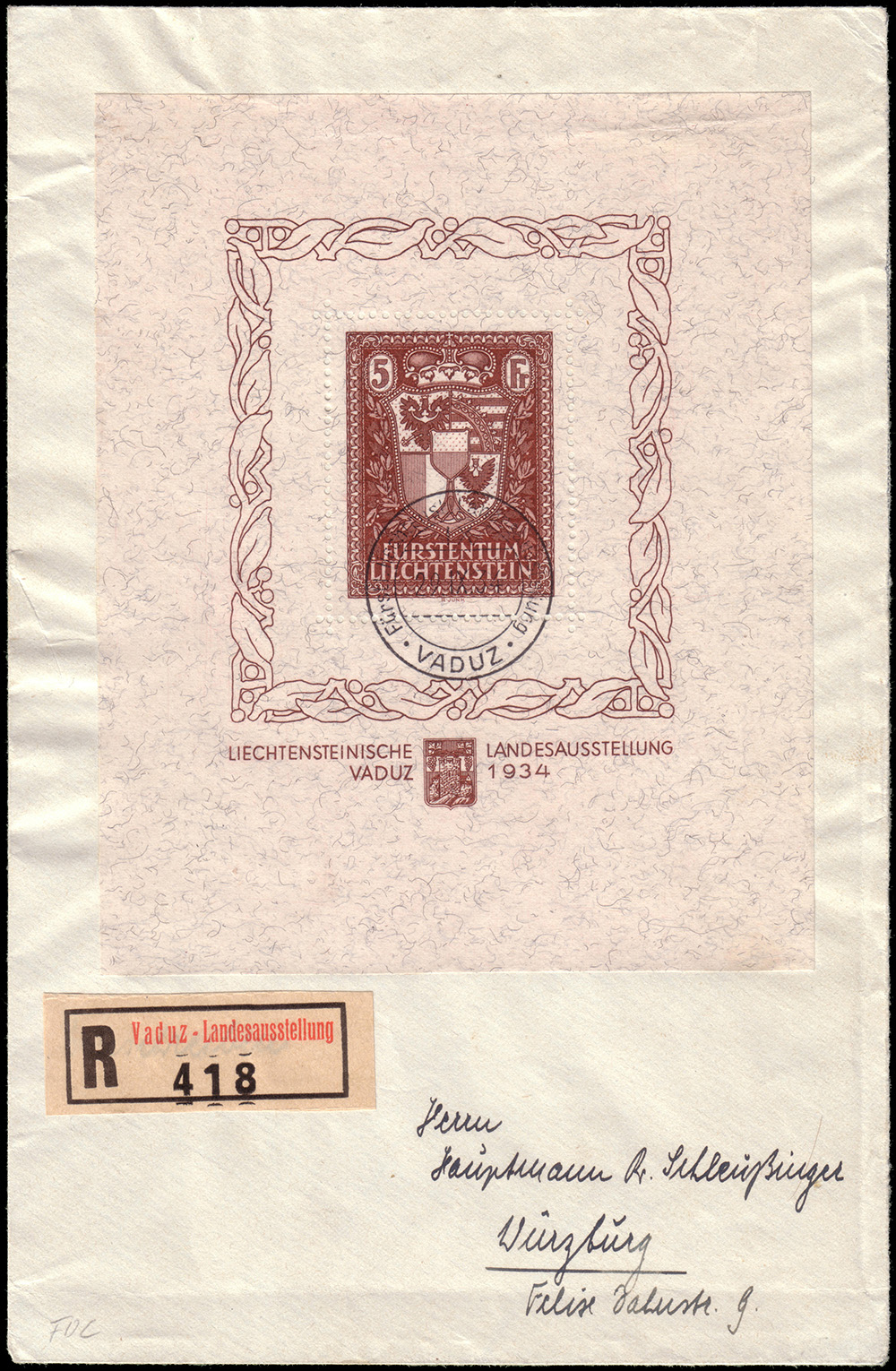 Foglietto "Esposizione filatelica di Vaduz". 5 franchi bruno rosso su busta spedita per raccomandata da Vaduz a Wurzburg (30.09), il primo giorno di emissione.