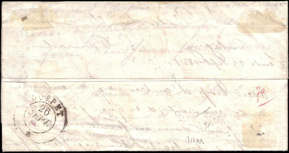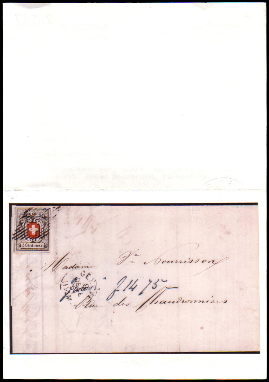 Lettera con testo spedita localmente da Ginevra per Céligny, affrancata con 5c. nero e rosso. Al verso timbro di transito a Coppet.
