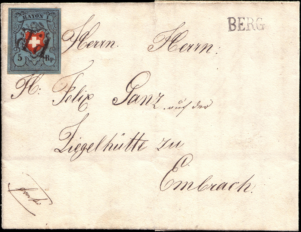 Letter with text from Berg to Embrach franked with 5Rp. black and red on blue without framed cross, "RAYON I".