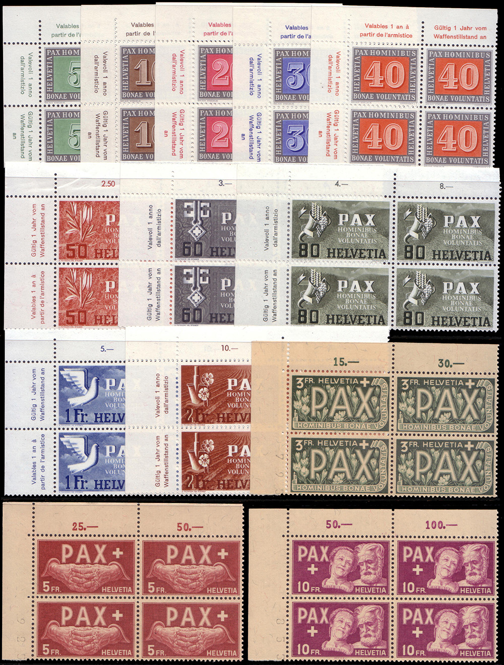 Lot 388 | [SVIZZERA] 1945"Pax". Serie completa di 13 valori in quartine angolo di...