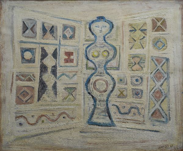 Massimo Campigli (Berlino, 1895 - St. Tropez, 1971) La scacchiera, 1963 Olio su tela, cm. 88x74 Firma e data in basso a destra. Autentica dell'autore su foto con timbro galleria Bergamini, Milano. Bibliografia: "Campigli pittore", a cura di Franco Russoli, edizione Il Milione, Milano 1965. Tav. XXXVII