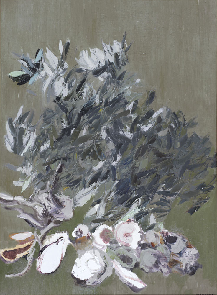 GIANCARLO CAZZANIGA Monza (Mi) 20/09/1930 - Interno con ramo d'ulivo, 1973, olio su tela cm. 81x60, firma in basso a destra, firma, titolo, anno e timbro della Collezione Walter Fontana al retro, dichiarazione d'autenticità dell'artista e Archivio delle opere di Giancarlo Cazzaniga su foto.