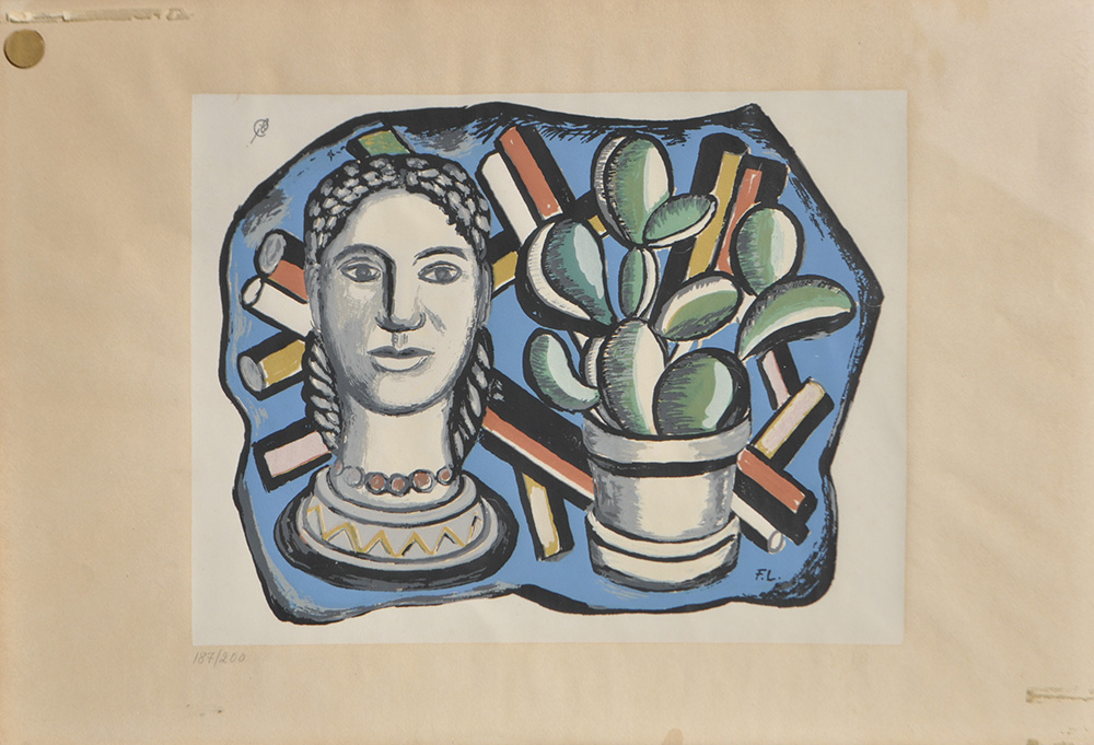 Ferdinand Leger Tête et Cactus, 1951;Farblithografie, 27 x 34,5 (Platte), 37 x 55 cm (Blatt), verso Etikette Ausstellung Livorno 1958