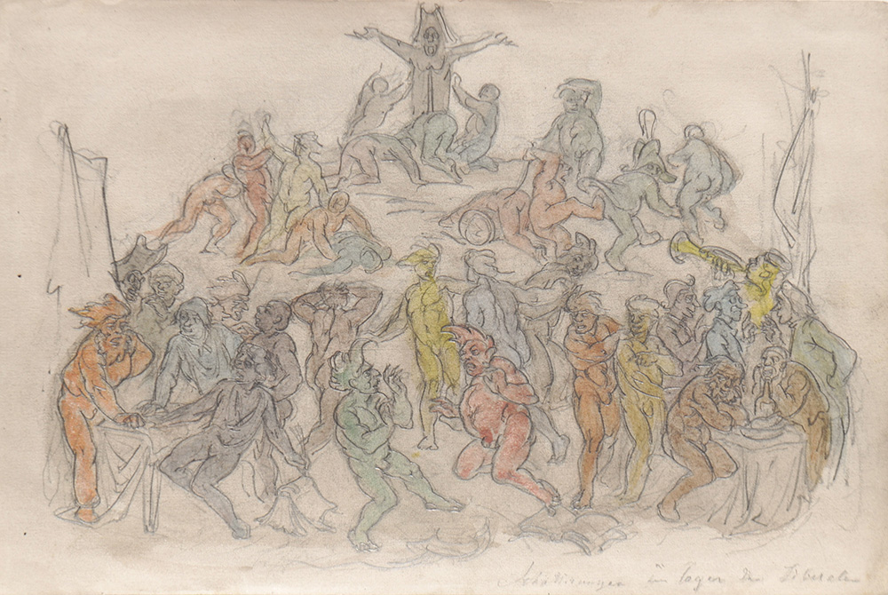 Heinrich von Schöpfer (Bozen/Bolzano 1821 – 1899) Schattierungen im Lager der Liberalen, um 1860;Bleistift, Aquarell, 16,5 x 24,5 cm
