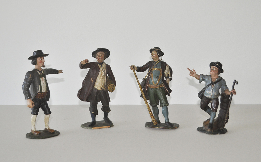 - 4 Krippenfiguren (Hirten), Tirol um 1800;Holz gefasst, max. Höhe 18 cm, Altersschäden