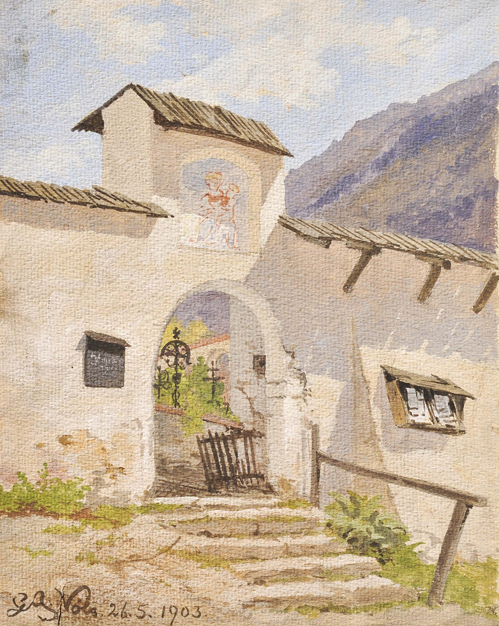 Gabriele Deininger- Arnhardt (München 1855 -1945) Friedhofseingang in Völs am Schlern, 1902;Aquarell, 29,7 x 23,5 cm, kleiner