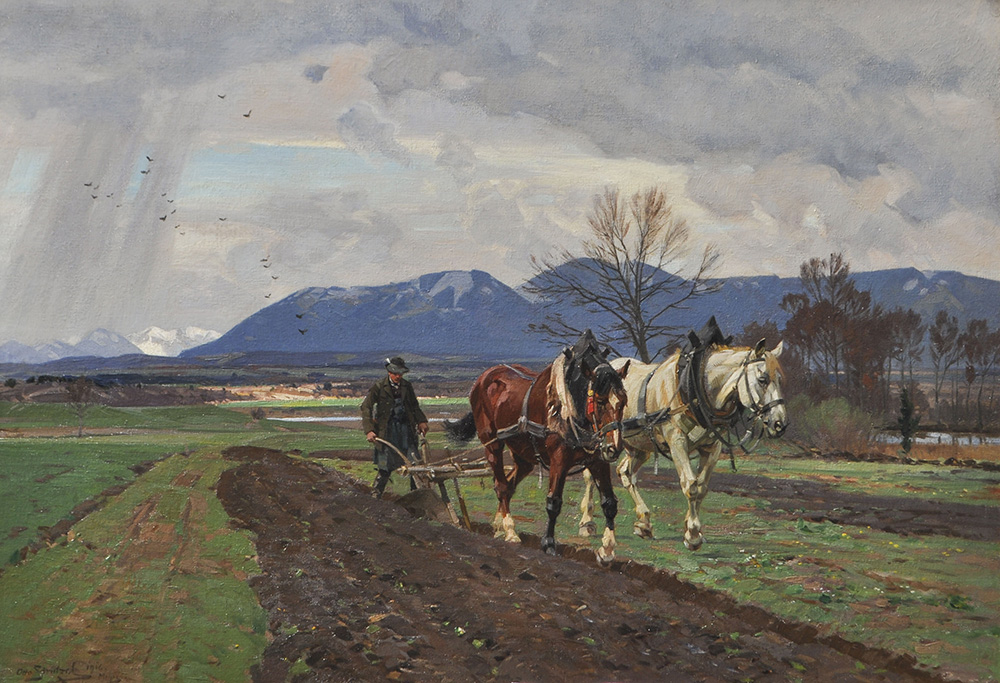 Otto Strützel (Dessau 1855 – Müchen 1930) Pflügender Bauer vor Brauneck und Karwendelspitze, 1916;Öl auf Leinwand, 70,5 x 101 cm, gerahmt