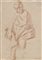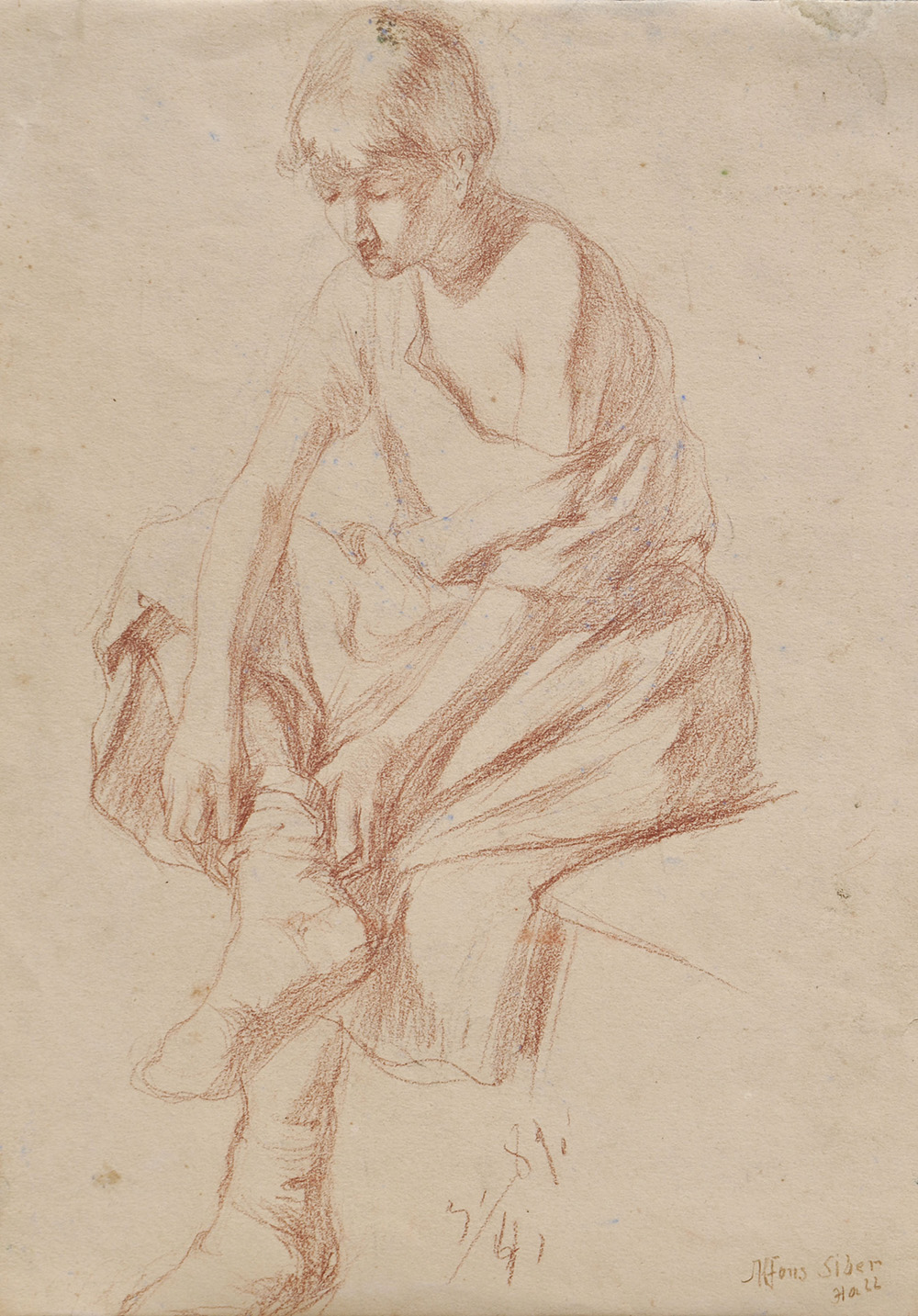 Alfons Siber (Schwaz 1860 – Hall in Tirol 1919) Mädchen beim Strümpfe-Anziehen, 1881;Rötel, 37,2 x 26,1 cm, leicht fleckig, kleine Knickstelle