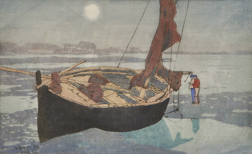 Carl Moser Fischerboot, 1928;Farbholzschnitt, 26 x 43 cm, gerahmt