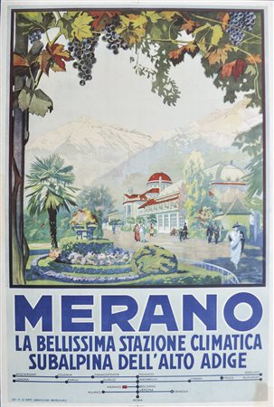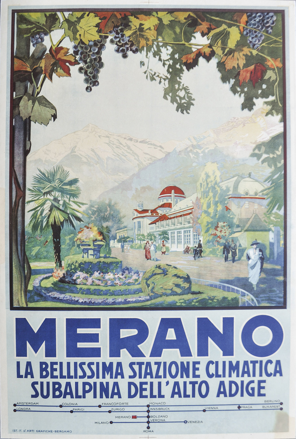 Anonym Plakat „Merano – La bellissima stazione climatica subalpina dell’Alto Adige, 1935;Lithografie, 98,5 x 66,5 cm, kleine Restaurierung am rechten unteren