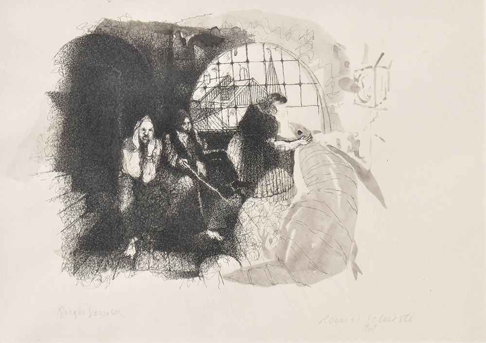 Reiner Schiestl (* Kufstein 1939) Zur „Verwandlung“ von Franz Kafka, 1967;Tusche, Aquarell, 28,5 x 40,8 cm, gerahmt