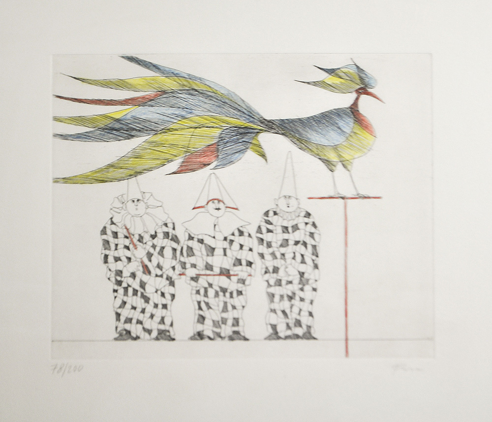 Paul Flora Harlekine und Pfau;Kolorierte Radierung, 19,5 x 24,5 cm