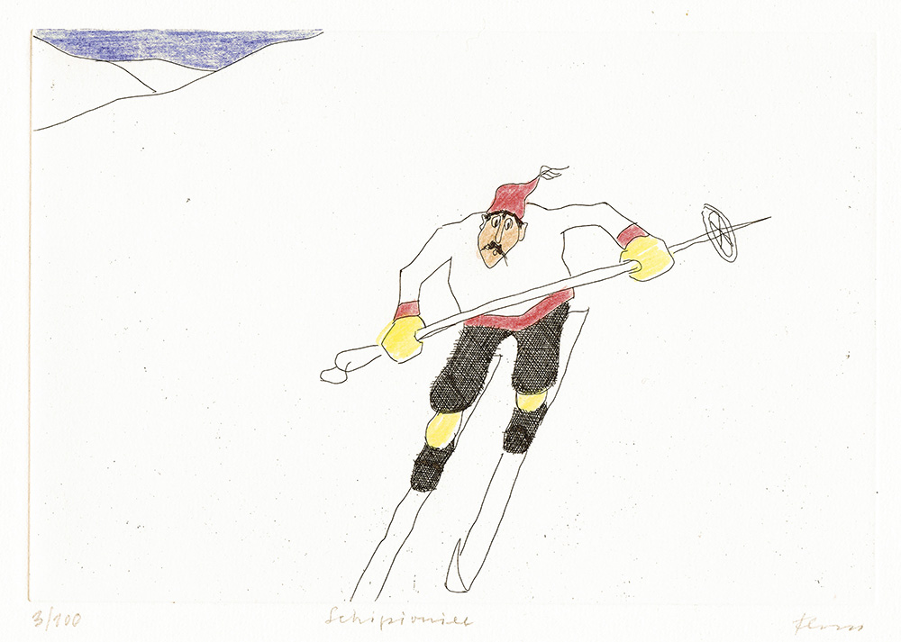 Paul Flora Schipionier, 2006;Kolorierte Radierung, 15 x 22 cm (Platte), gerahmt