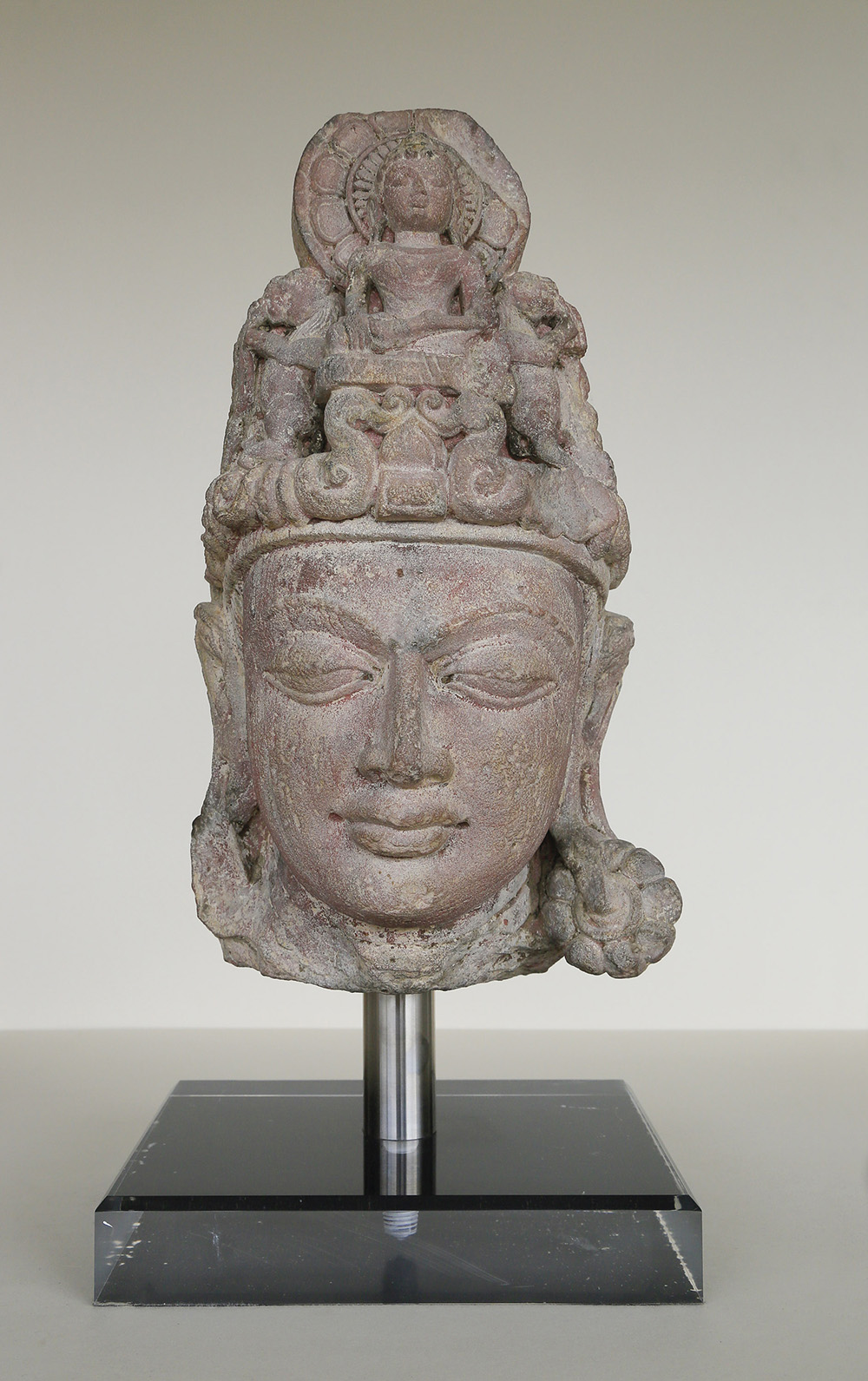 - Kopf eines Buddhajüngers, Zentralindien, 11./12. Jh.;Hellgrauer Sandstein, Höhe 37 cm