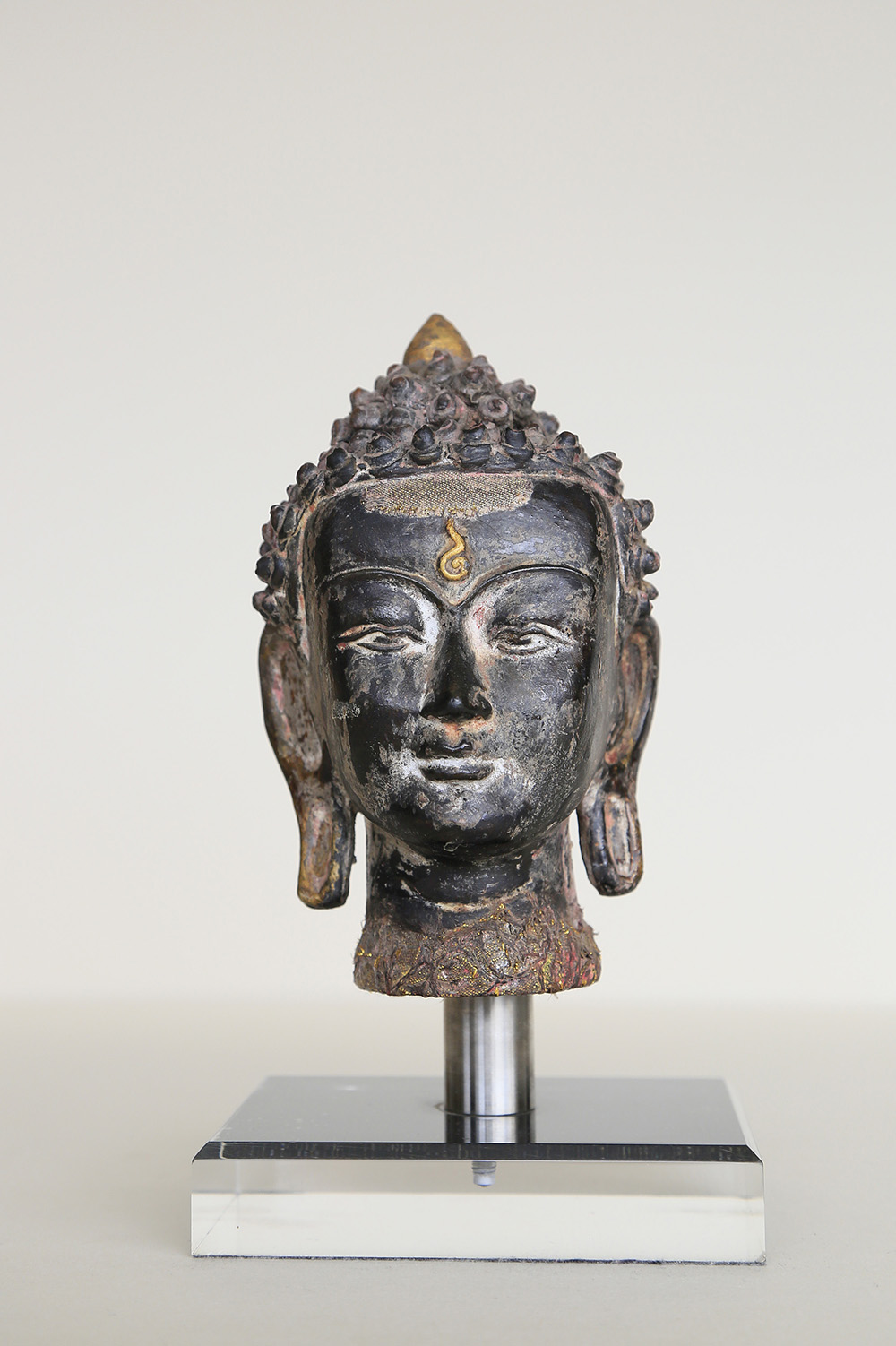 _ Kopf eines Buddha, Tibet, 18./19. Jh.;Bemalte Terrakotta mit Stoffresten, Höhe 17 cm, ursprünglich Ganzfigur