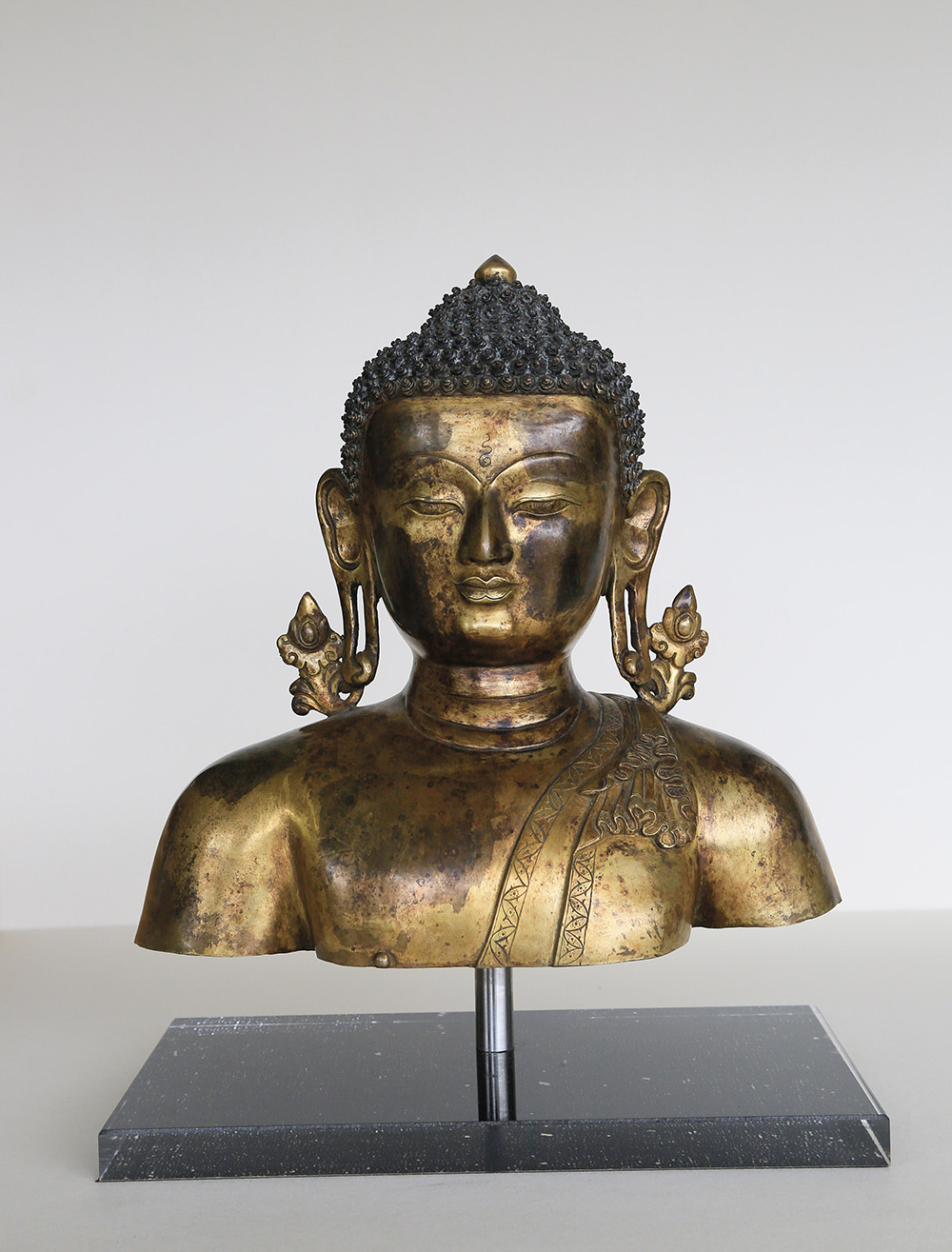 - Buddha, Nepal, Mitte 20. Jh.;Feuervergoldete Bronzebüste, sehr feine Arbeit