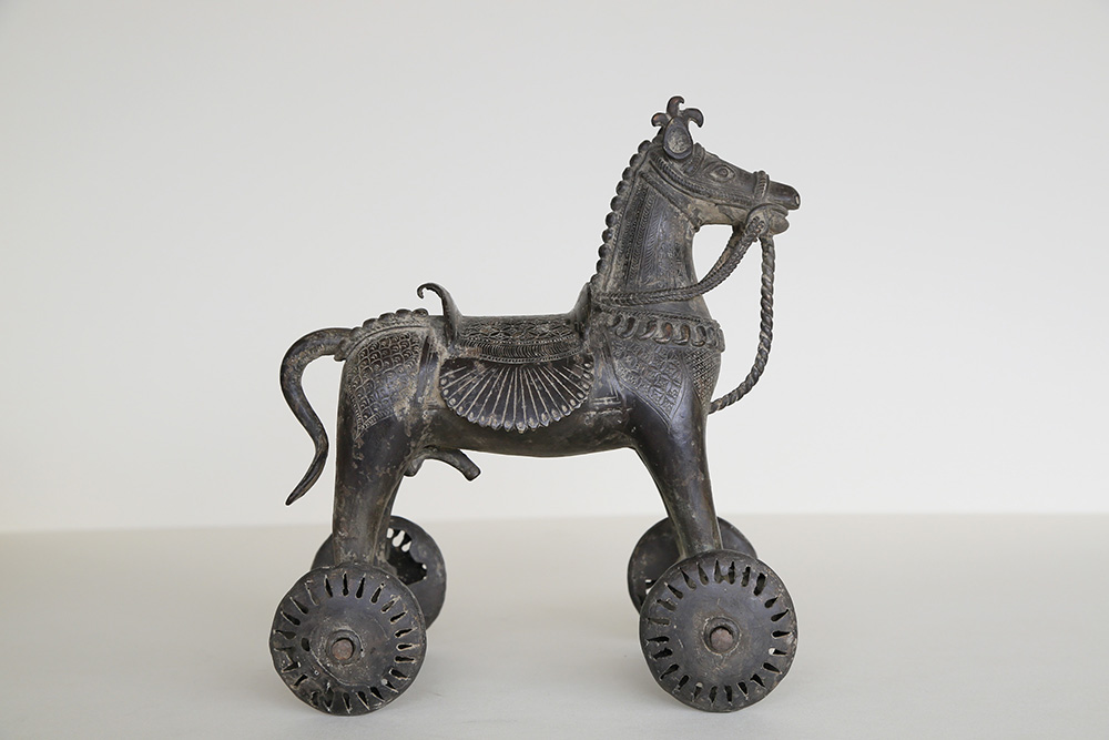 - Reitpferd auf Rädern, Indien, 19 Jh.;Bronze, Höhe 27 cm