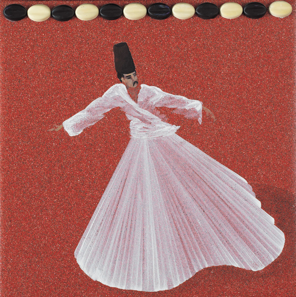 ALDO MONDINO Torino 04/10/1938 - 10/03/2005 - Derviscio, 1998, olio e cioccolatini su linoleum cm. 40x40, firma ed etichetta della Galleria De Nisi (Caserta) al retro, opera registrata presso l'Archivio Aldo Mondino come da dichiarazione e scheda allegati.