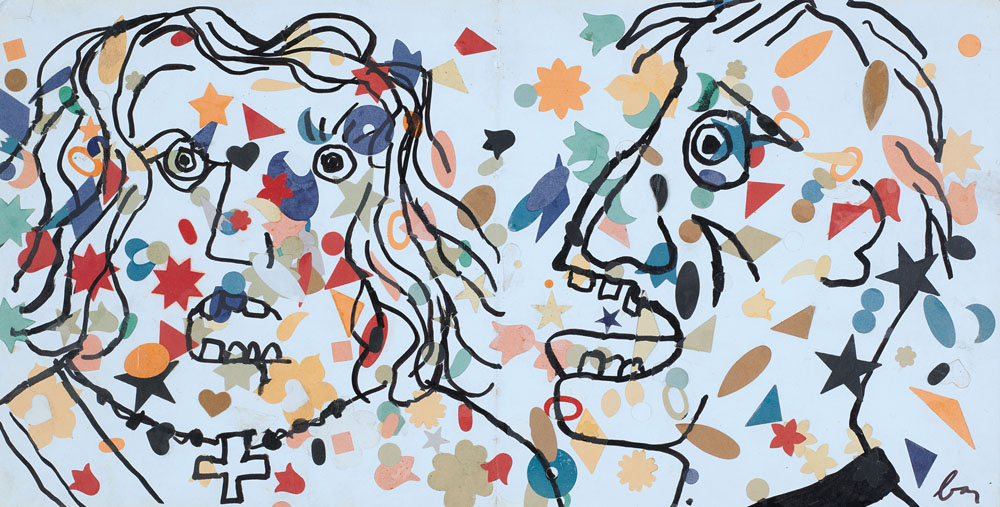 ENRICO BAJ Milano 31/10/1924 - Varese 15/06/2003 - Figure, 1973, acrilici e collage su carta cm. 27x53, firma in basso a destra, dichiarazione d'autenticità dell'artista, etichetta e firma per autenticità e provenienza della Galleria Gio' Marconi (MI) su foto.