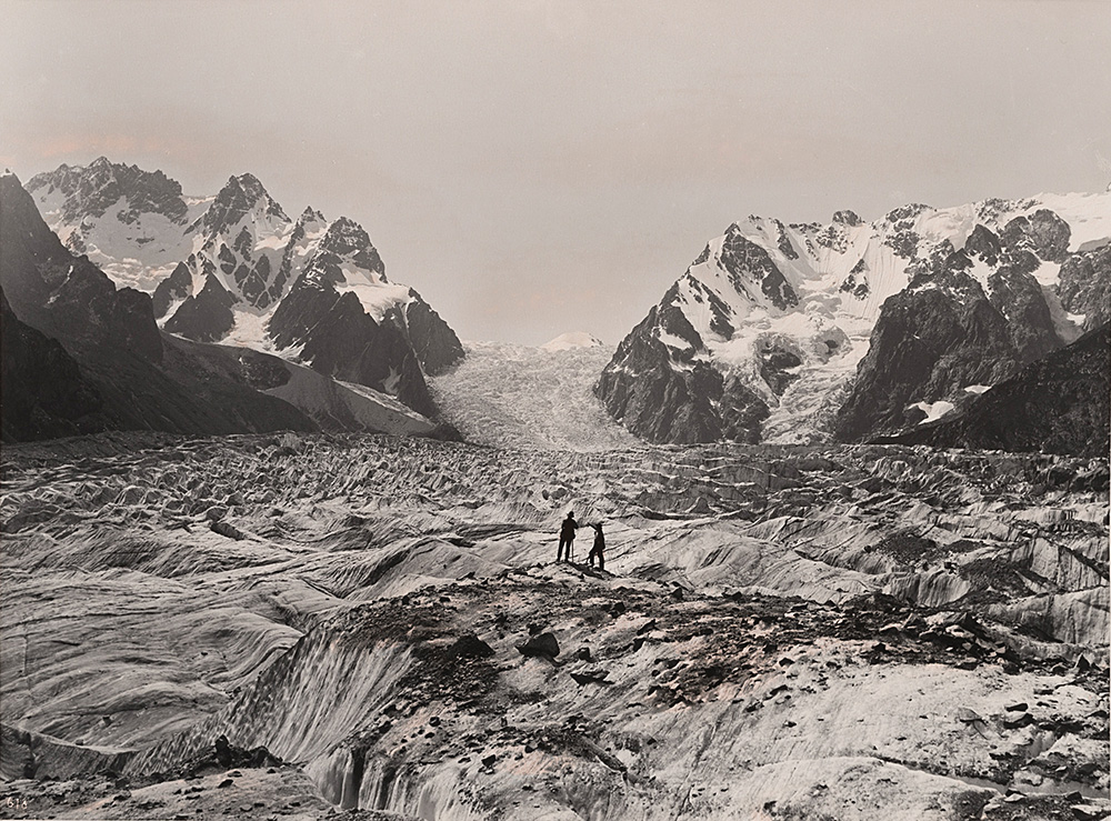 VITTORIO SELLA (1859 - 1943) Parte superiore del ghiacciaio Karagom dalla piattaforma del ghiacciaio Karagom, anni 1890 Stampa vintage alla gelatina ai sali d'argento virata in doppio tono 29,8 x 39,5 cm (28 x 37,5 cm immagine) Scritta successiva a penna nera lungo il margine inferiore con data e titolo Opera accompagnata da Certificato rilasciato dalla Fondazione Sella
