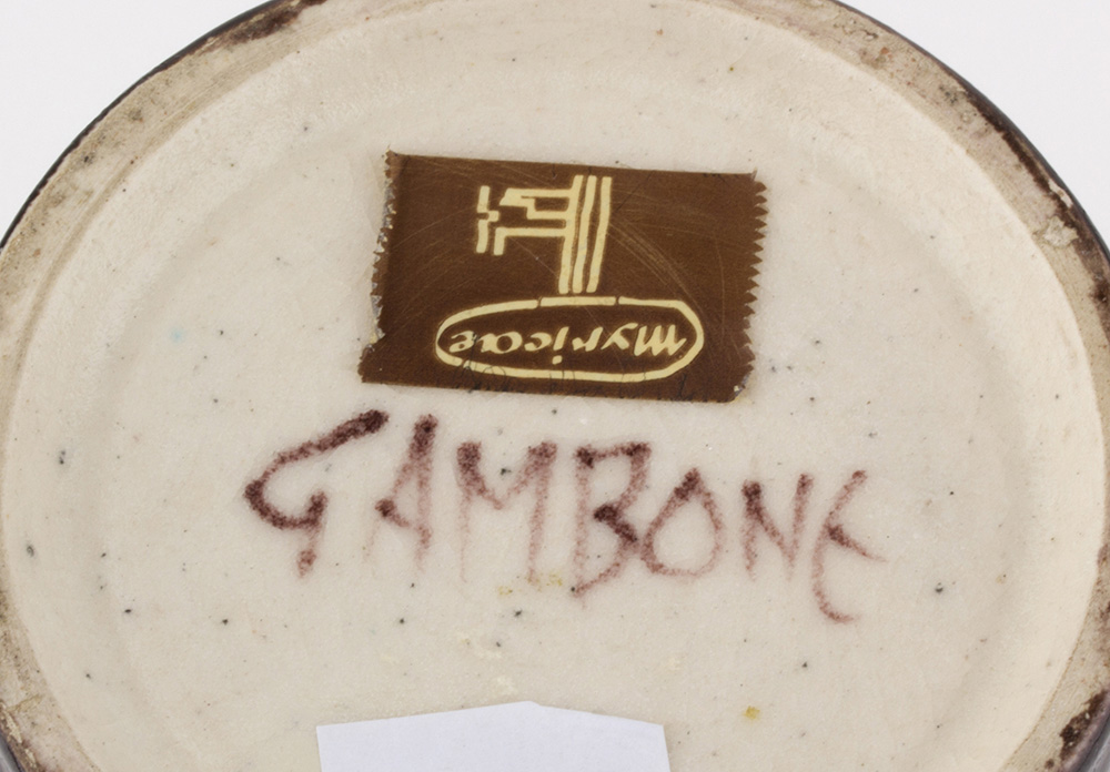 BRUNO GAMBONE Vaso a strisce nere, rosse e beige Terracotta dipinta, h. 20 cm Firma sotto alla base: Gambone Etichetta sotto alla base: Myricae