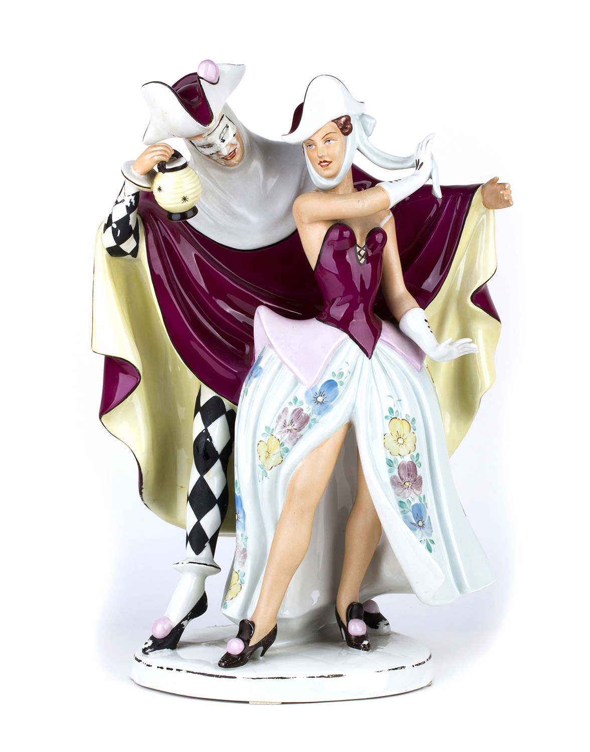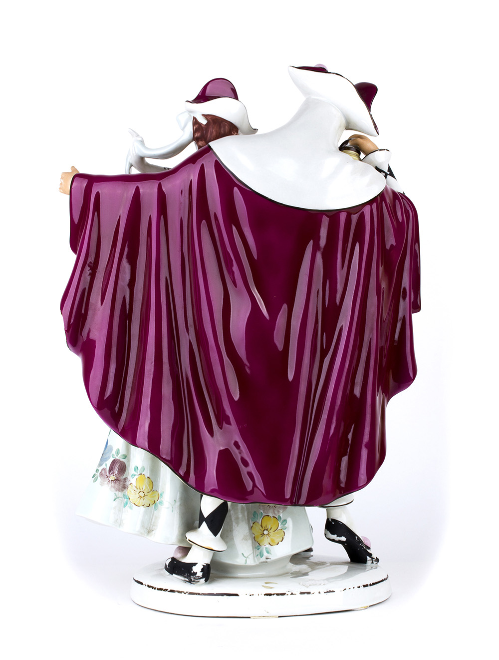 ROYAL DUX - BOHEMIA Coppia in maschera, 1940 circa Gruppo in ceramica policroma decorata sopra vernice, 50 x 34 x 20 cm circa Marchio impresso sotto la base: Royal Dux Bohemia CONDITION REPORT Qualche caduta degli smalti sopra vernice