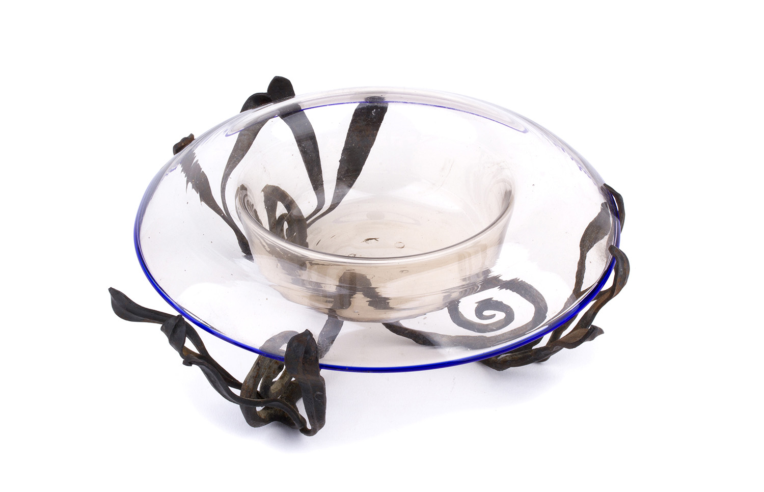 MANIFATTURA MURANESE Piccola alzata, anni ‘20 Coppetta in vetro soffiato trasparente con bordino in pasta di vetro blu, supporto in ferro battuto a rametti di ulivo nello stile di Umberto Bellotto, h. 7,5, d. 18 cm