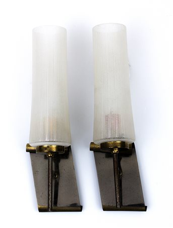 MANIFATTURA ITALIANA Coppia di appliques, anni ‘40 Struttura in metallo ottonato, diffusori in vetro satinato e inciso, h. 33 cm (cada una)