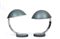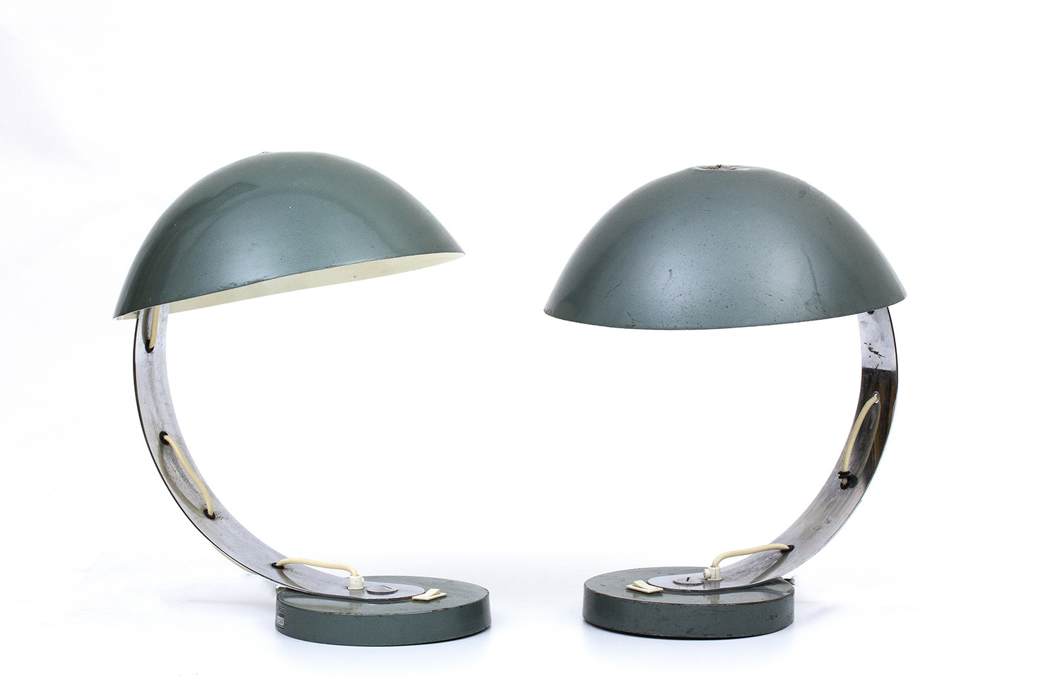 MANIFATTURA ITALIANA Coppia di lampade da tavolo ad arco, anni ‘60 Struttura in metallo cromato con base e diffusore laccati in verde , 45 x 34 x 40 cm (cada una)